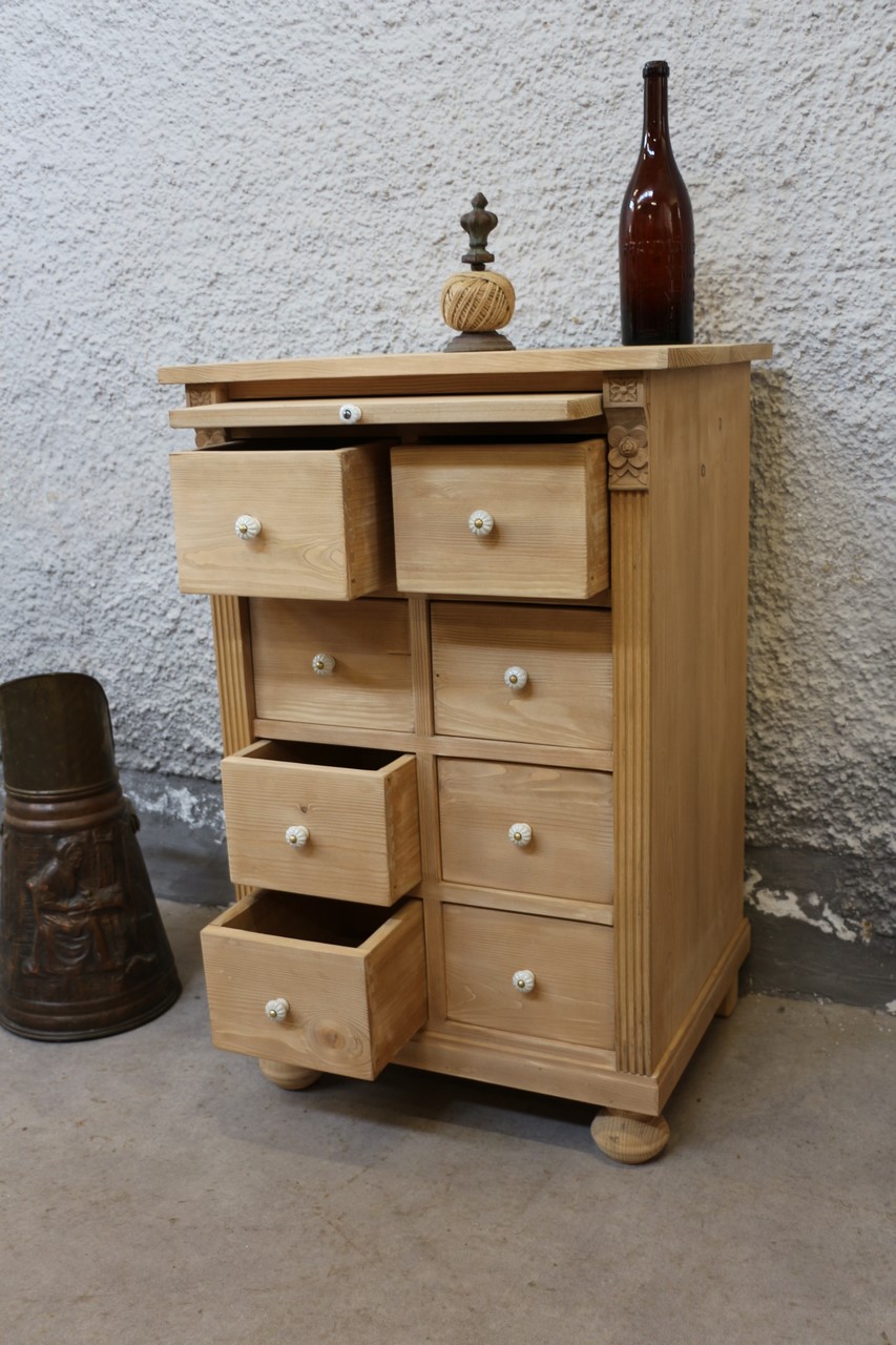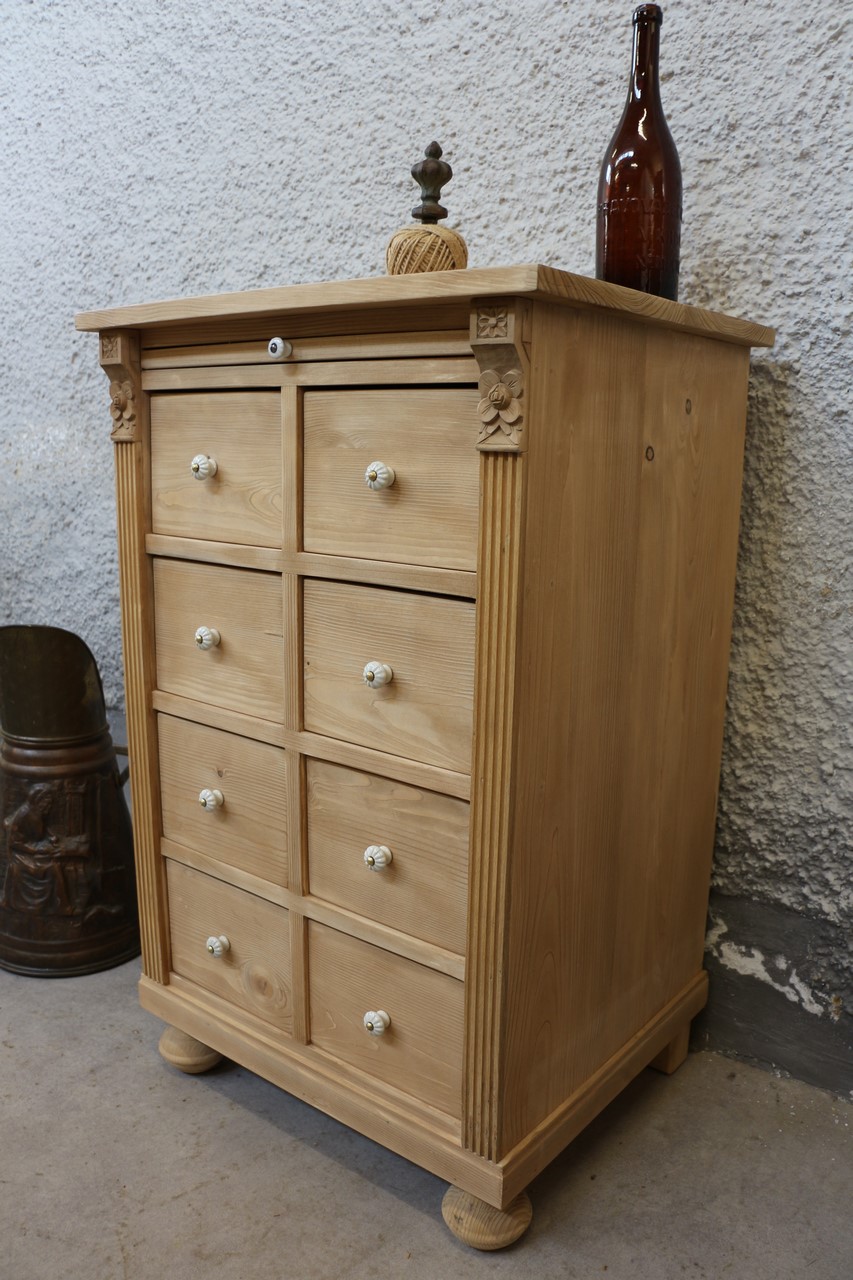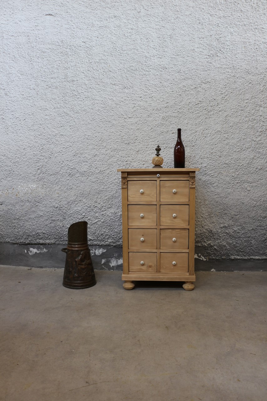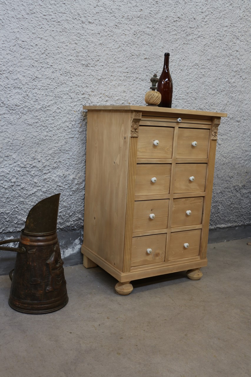 An eight-drawer chest crafted entirely from solid spruce wood. Handcrafted, available with a waxed or natural finish, with optional RAL colour choices.