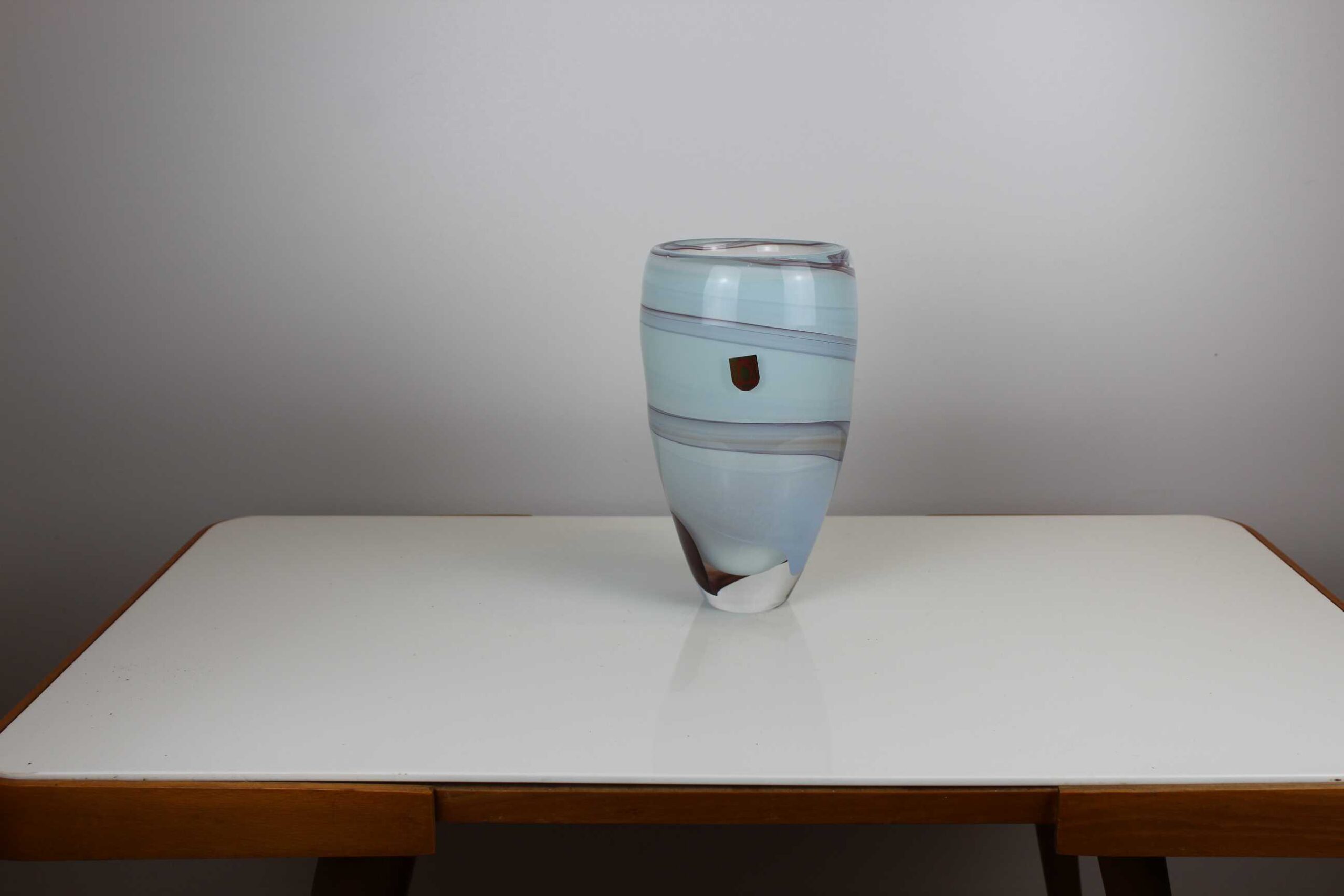 This 32 cm Rubinglas vase combines a minimalist silhouette with delicate white striping, giving it a soft, refined look. Each piece is individually hand-blown and shaped, making it unique. The semi-translucent finish enhances light reflection and fits perfectly into modern, Scandinavian, or classic interiors as a decorative accent or flower vase.