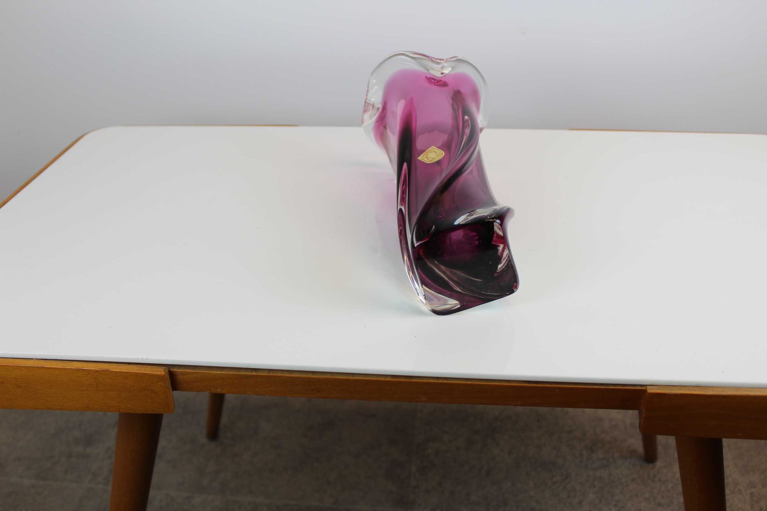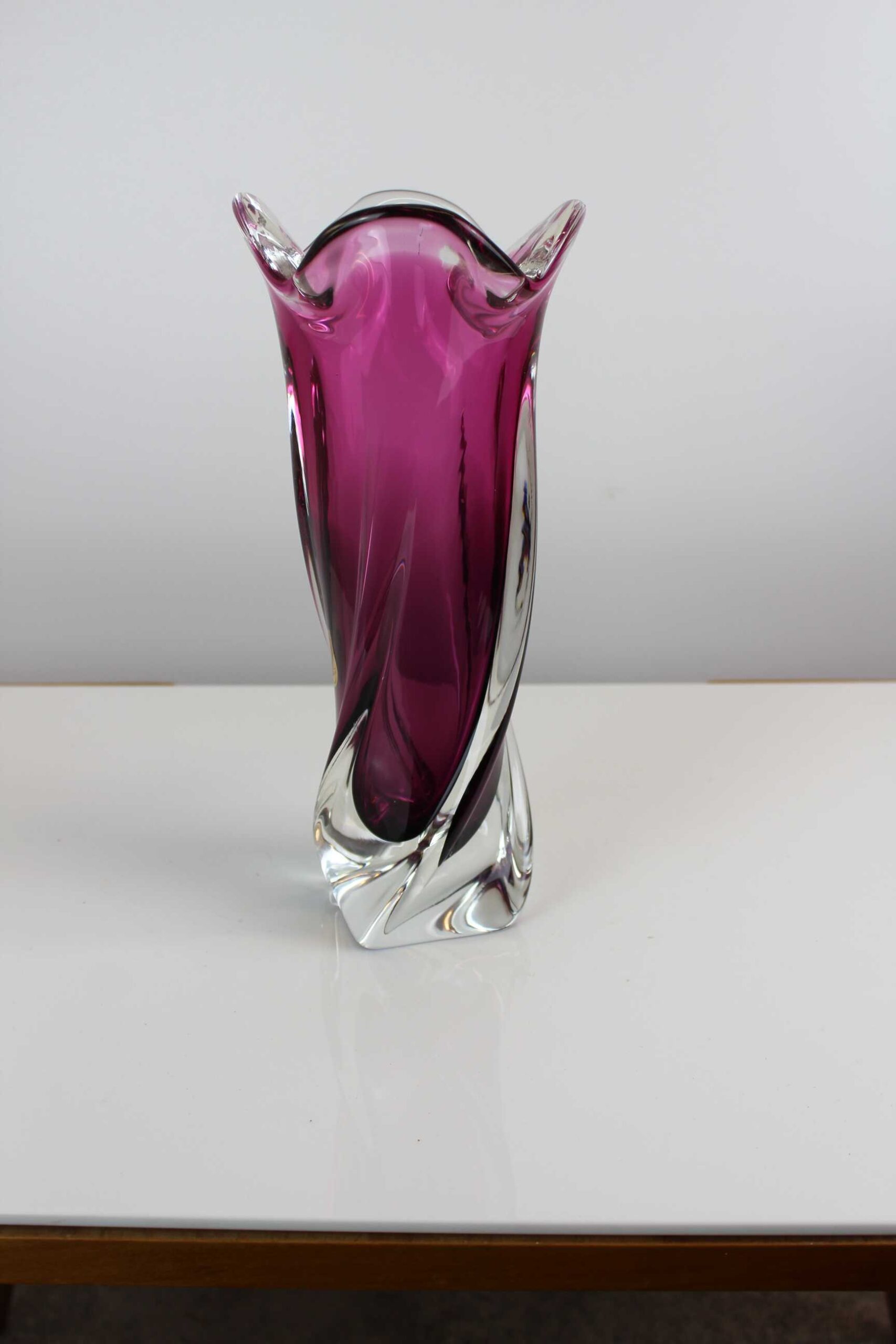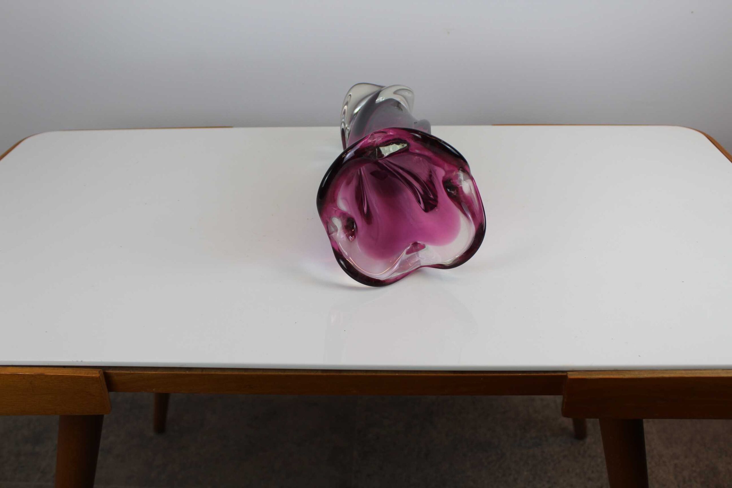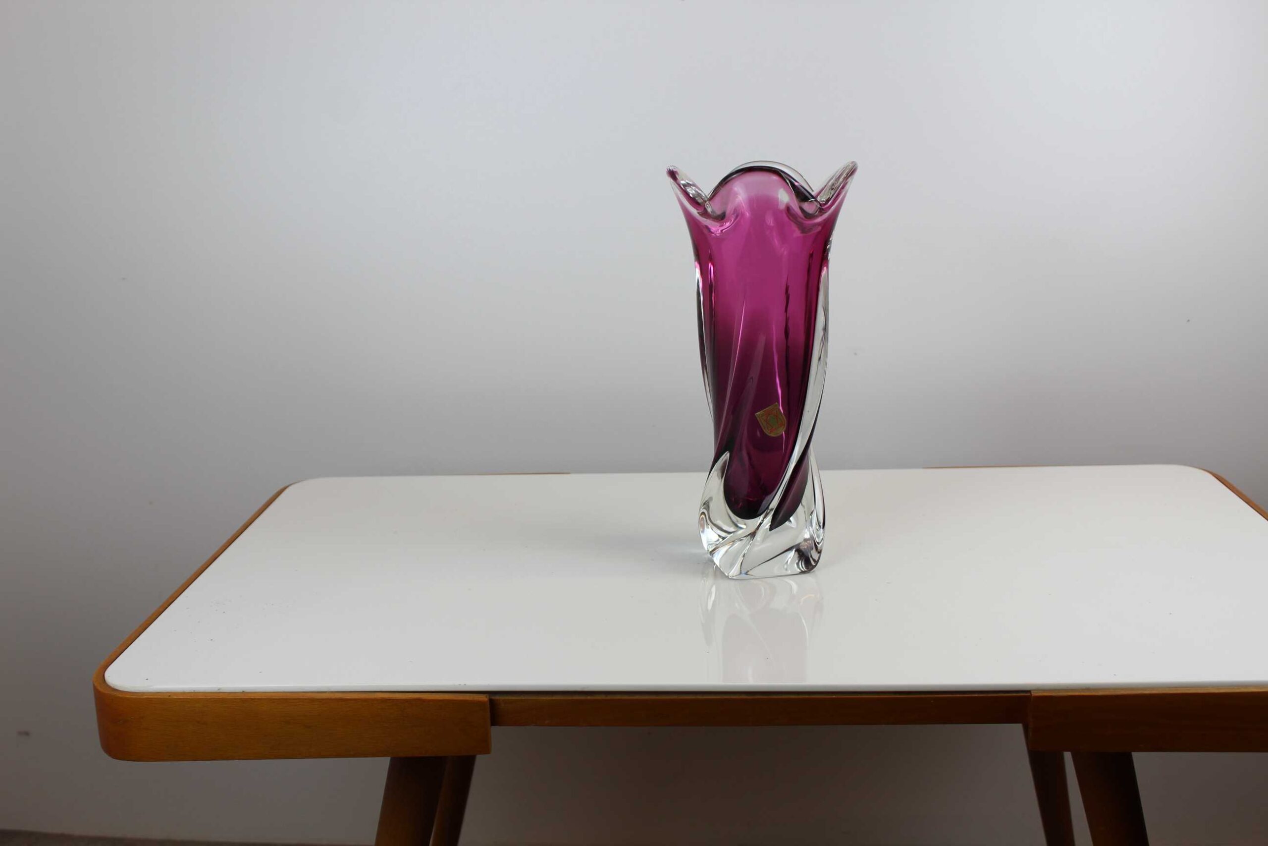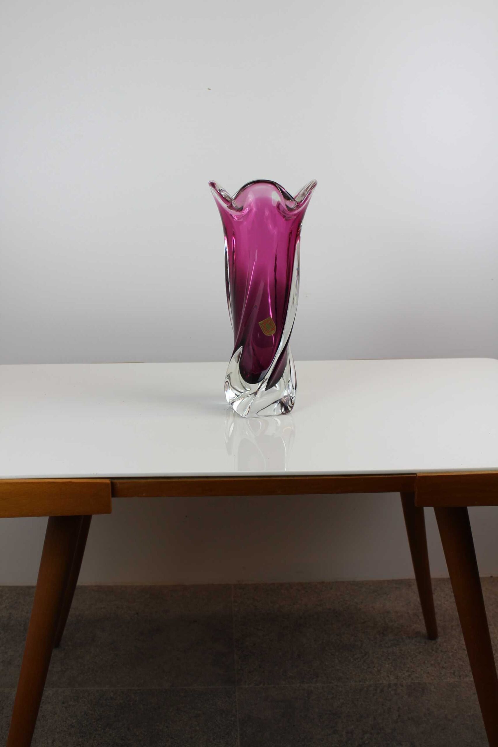 Elegant hand-blown pink-clear Rubinglas vase with twisted design. Refined Czech glass full of depth and sophistication.