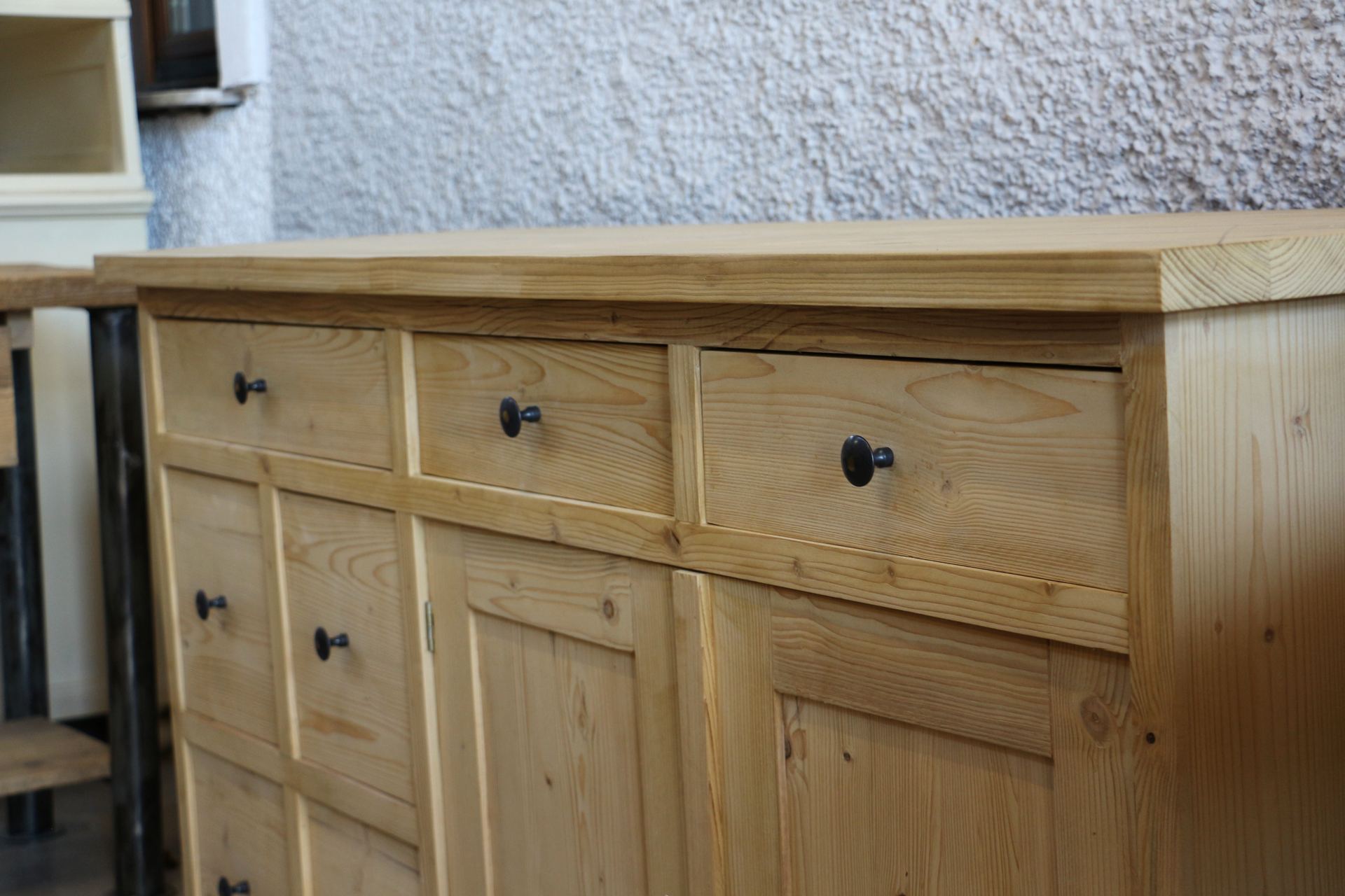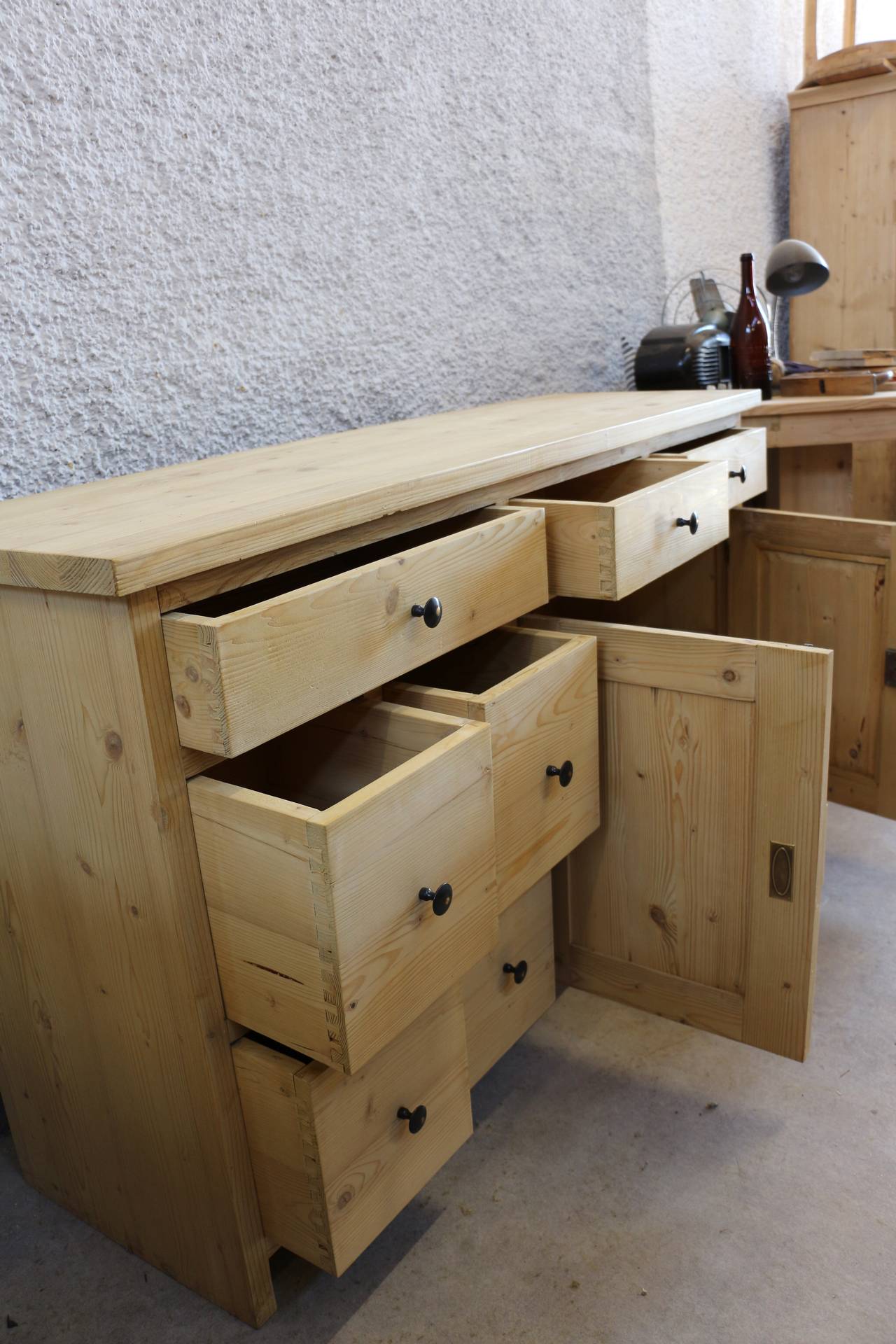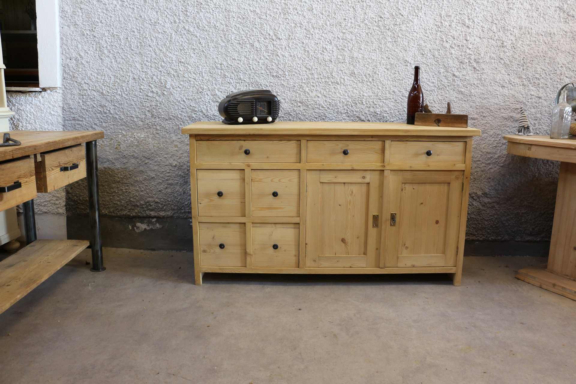 It features practical drawers and cupboard doors, offering ample storage space for crockery, linens, or household items. The drawers are traditionally dovetail-jointed, guaranteeing strength and long-term reliability.