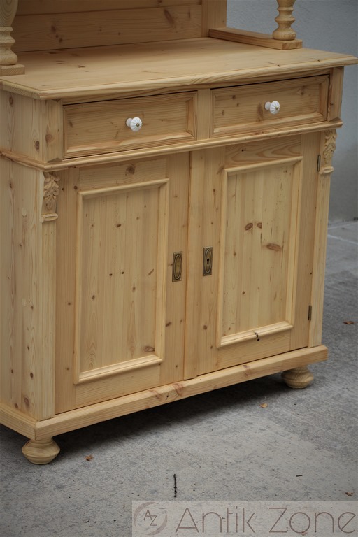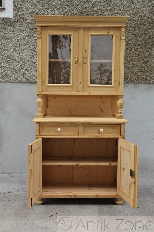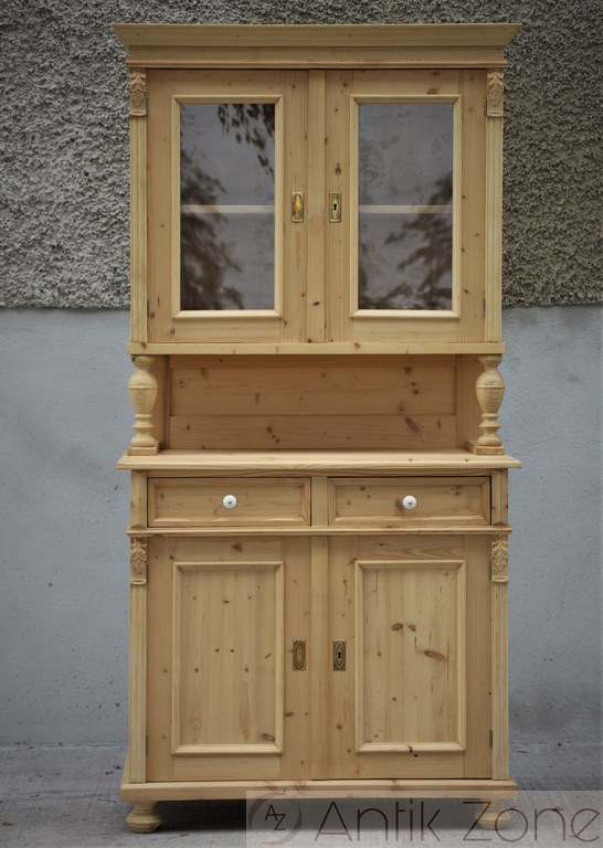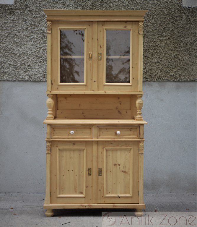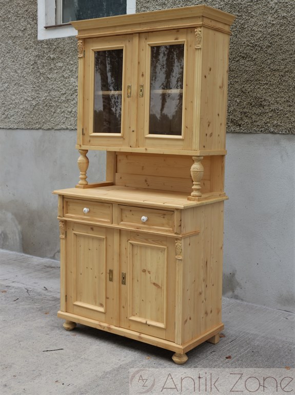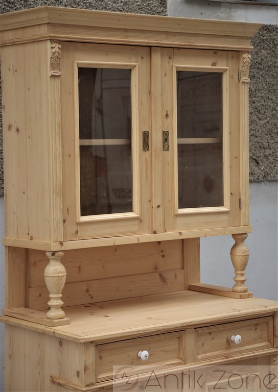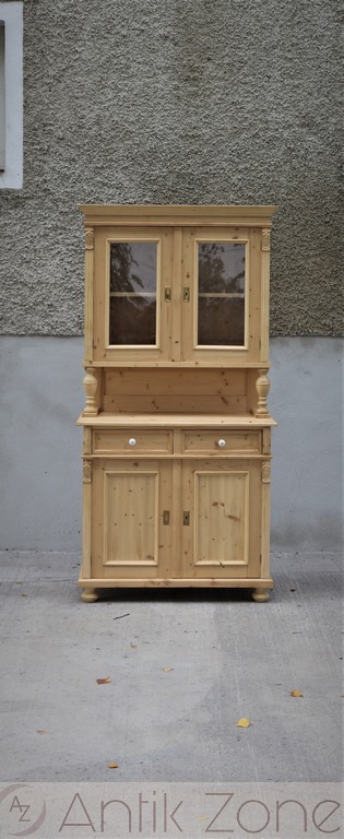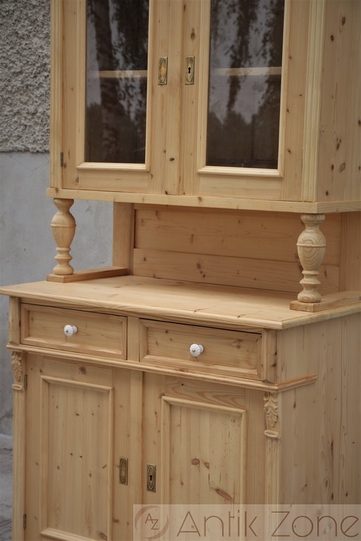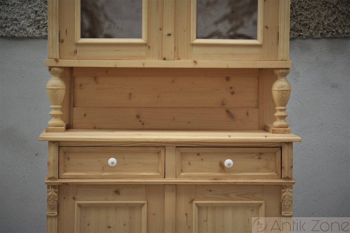 Tato kuchyňská skříň je vyrobena tradiční ruční výrobou v nejvyšší kvalitě z masivního smrkového dřeva. Jedná se o repliku historického nábytku z období Gründerzeit, inspirovanou původními tvary a řemeslnými postupy.